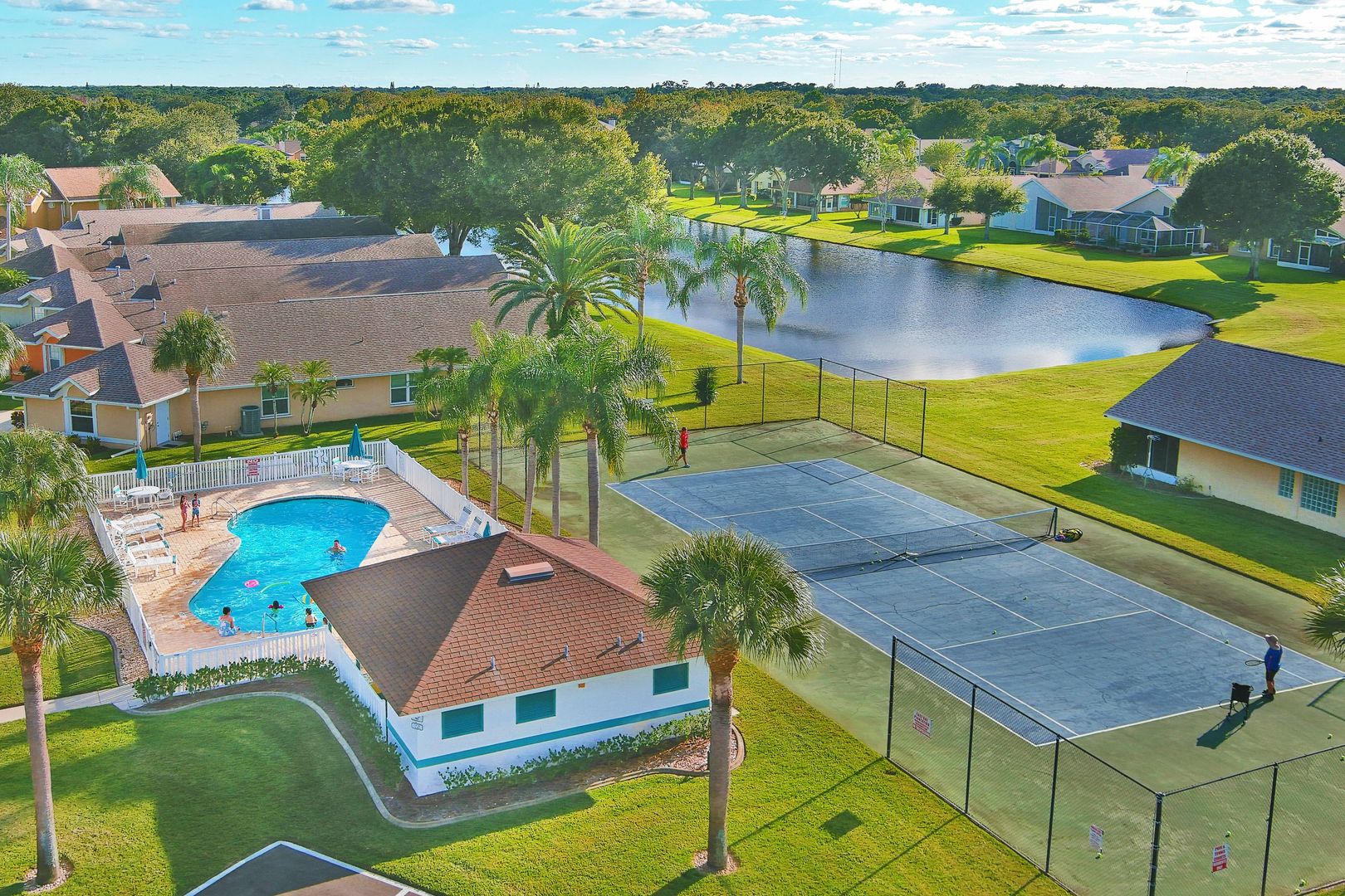 2 story home with 3 bedrooms, 2.5 baths, living room, open & spacious Family room with fireplace. Kitchen with granite countertops, white cabinetry, gas range & window seat with storage. Dining room. 1st floor half bath. Spacious Primary bedroom with balcony & walk-in closet. Primary bathroom with dbl. sinks, jetted tub & walk-in shower. Laundry room. Screened patio and open patio. Tesla Solar Roof for LOW FPL bills! Two car garage. Community pool, clubhouse, tennis. Walk to Publix or the King Center. Standard lawncare included. Renters Insurance Required.