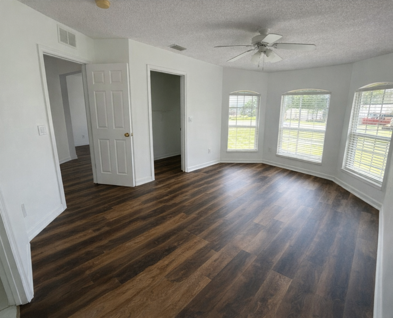 The home has an open layout with beautiful wood-look flooring throughout the main areas, giving it a clean, modern feel. The living and dining spaces get great natural light from the large windows and sliding glass doors, making it feel open and inviting.